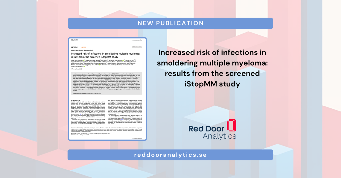 In our latest publication, we investigated infection risk in individuals with smoldering multiple myeloma (SMM) using data from the iStopMM study in Iceland. SMM is an asymptomatic precursor condition to multiple myeloma, affecting approximately 0.5% of people over 40 years old (Thorsteinsdóttir et al., 2023). This study includes 188 individuals with SMM from a screened population-based cohort, providing first insights into infection risk in this patient group. We found that individuals with SMM had significantly increased infection risk compared to both those without precursor conditions and those with MGUS (the earlier precursor stage). These findings revealed an so far underestimated infection burden even among low risk SMM patients.
