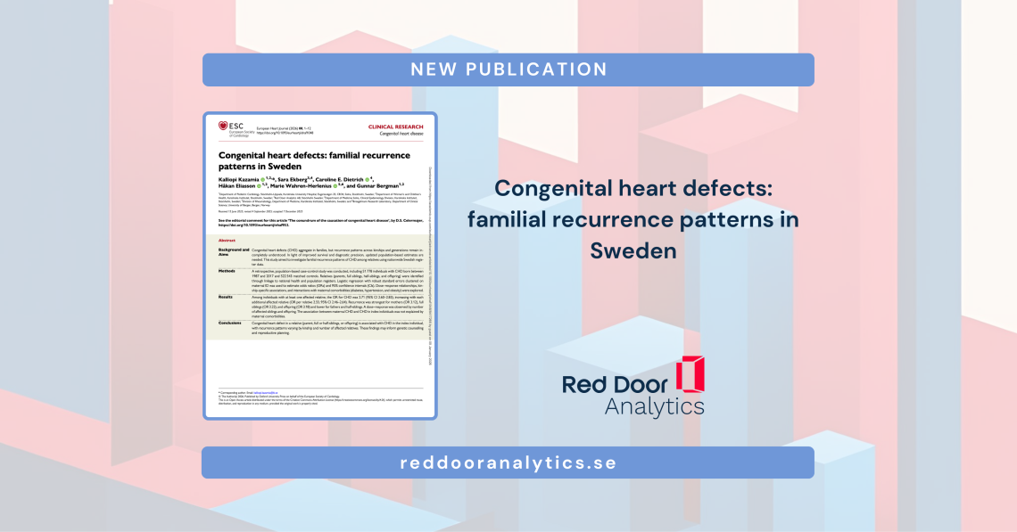 In our latest publication we used Swedish register data to examine familial aggregation of congenital heart defects (CHD) across kinships and generations. The authors found clear dose-response patterns between CHD risk and the number of affected relatives. Recurrence patterns varied by kinship type and degree of genetic relatedness, with the strongest associations observed among mothers, full siblings, and offspring – whilst more modest associations were found for fathers and half-siblings, supporting both genetic and potential maternal-specific mechanisms.